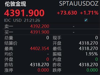 【大河财立方消息】1月2日,现货黄金向上触及4400美元/盎司红牛策略,日内上涨1.89%。截至发稿,现货黄金回落至4391.900美元/盎司,日内上涨1.71%。